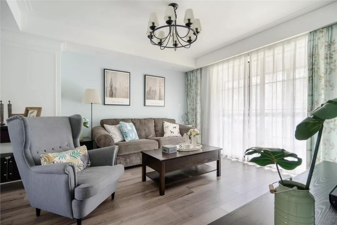 浅蓝色的沙发背景墙上挂着简约的挂画,搭配着小碎花的窗帘和素雅的沙发、茶几,整个客厅给人一种清新自然的舒服感。