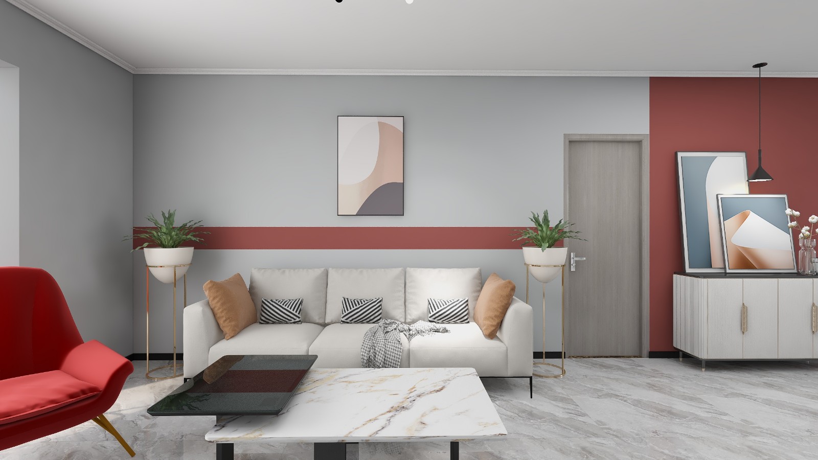 沙发区运用橘色块与灰色搭配,配上白色石膏线框,加上现代装饰画,层次丰富雅致。三人座白色沙发与白色茶几相互呼应,整个地面用大理石花纹瓷砖平铺,提亮整个空间亮度。