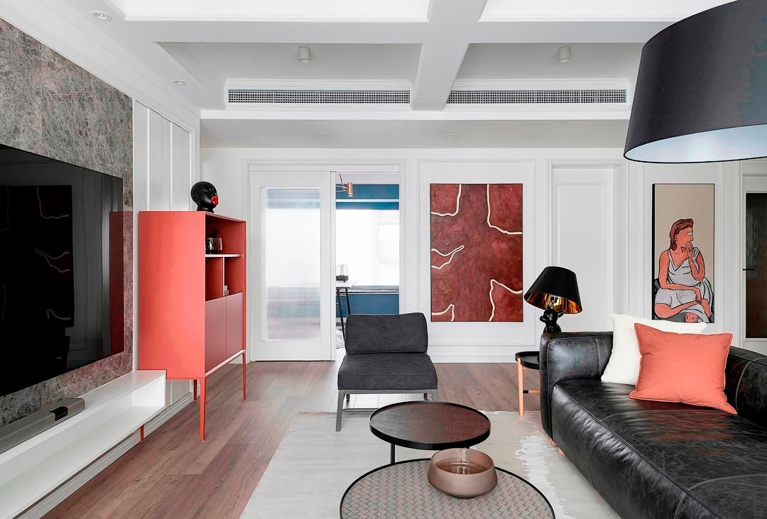 置身于客厅中央,能感受到黑白对比、红油画、以及大理石的协同作用