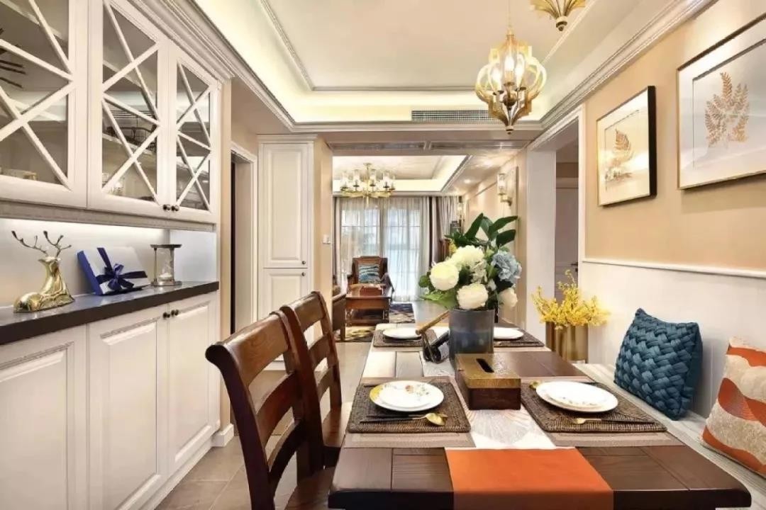 用卡座代替一边的座位布置满足6人同时用餐的餐厅卡座还别具有收纳功能。