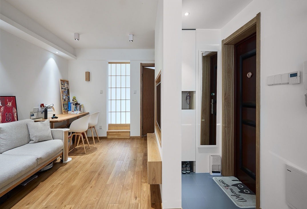 入门处利用一堵白墙,形成一方小小的玄关,避免“开门见山”——进入室内便直面客厅。同时白墙还可以作为电视背景墙再次利用起来!直面的诠释了家居生活设计要注重功能设计。