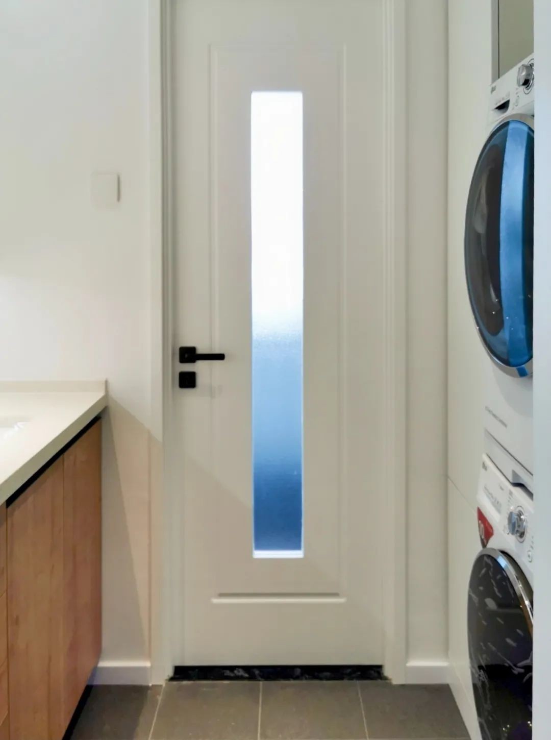 卫生间做了干湿分离,门里面是淋浴和马桶,门外属于干区,设置了洗面台和洗衣机、烘干机。