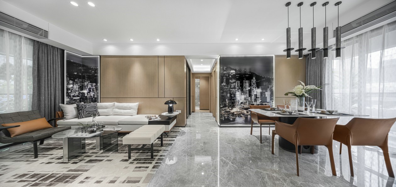 客厅运用黑色细小线条与大面柔和木饰面的考究比例划分,结合空间中的大幅维港夜景图面,就像透过穿梭于香港与内地的男主人其镜头,纪录下***代表性的图像,进而通过蒙太奇艺术手法的拼接,成为空间主题,体现了两地的紧密联系与蓬勃发展的时代脉搏。