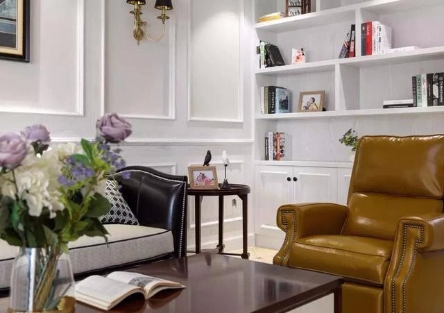 客厅和智能体线条明朗,空间划分明确,美式风格中常见的元素,如护墙板、石膏线也被大量的运用其中。复古地板的加入,实现了现代与复古的碰撞和融合。