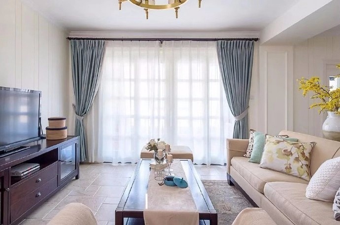 淡蓝色的窗帘 在整个淡色空间多了一点生机,米色的沙发使整个空间特别清爽明亮