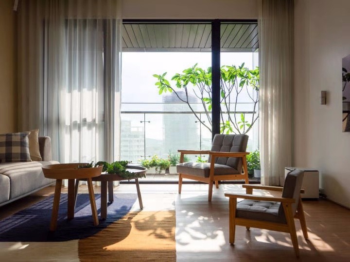 阳台的绿植与客厅的色调和谐,大片的绿植透过阳台门洒在客厅,整个环境的光影效果出来了,是自然舒适的。