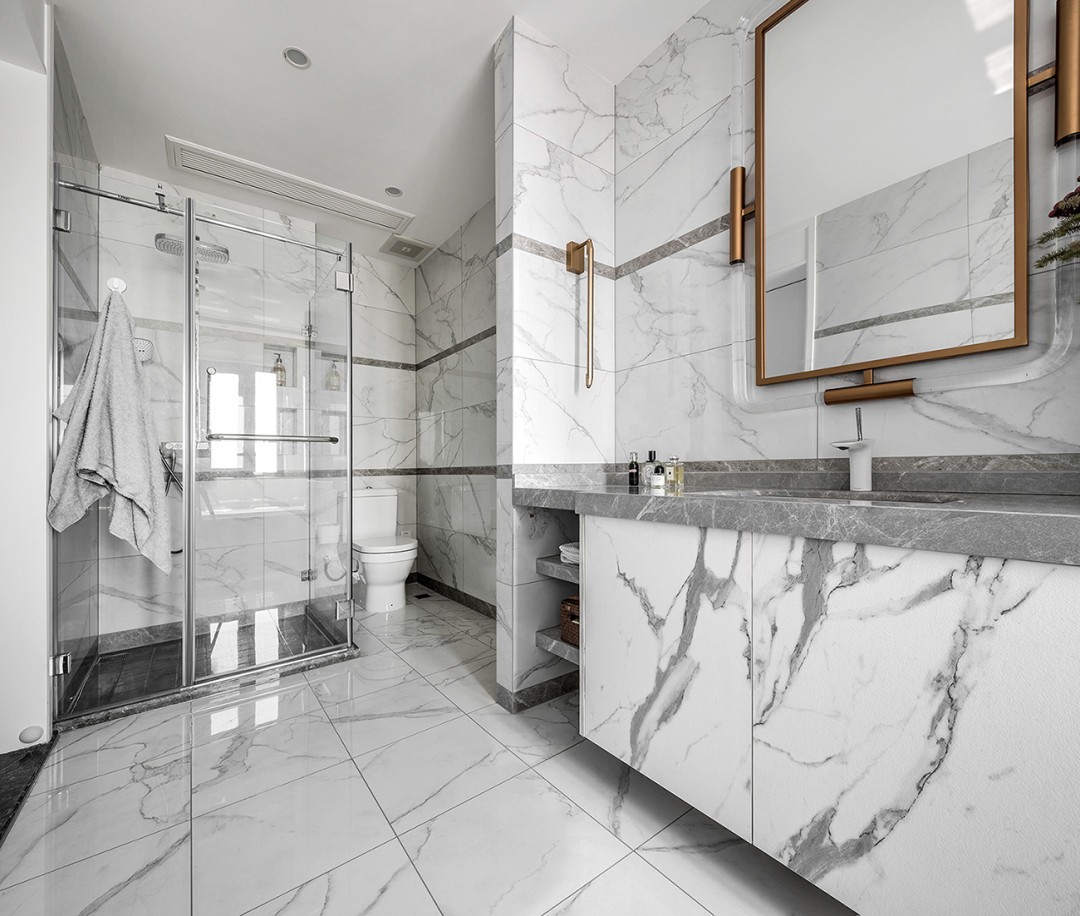 为免单调,设计师在白色台面配上黑金色系的水龙头,墙上的壁灯装饰,转型独特,与之呼应,中式的精致感扑面而来。