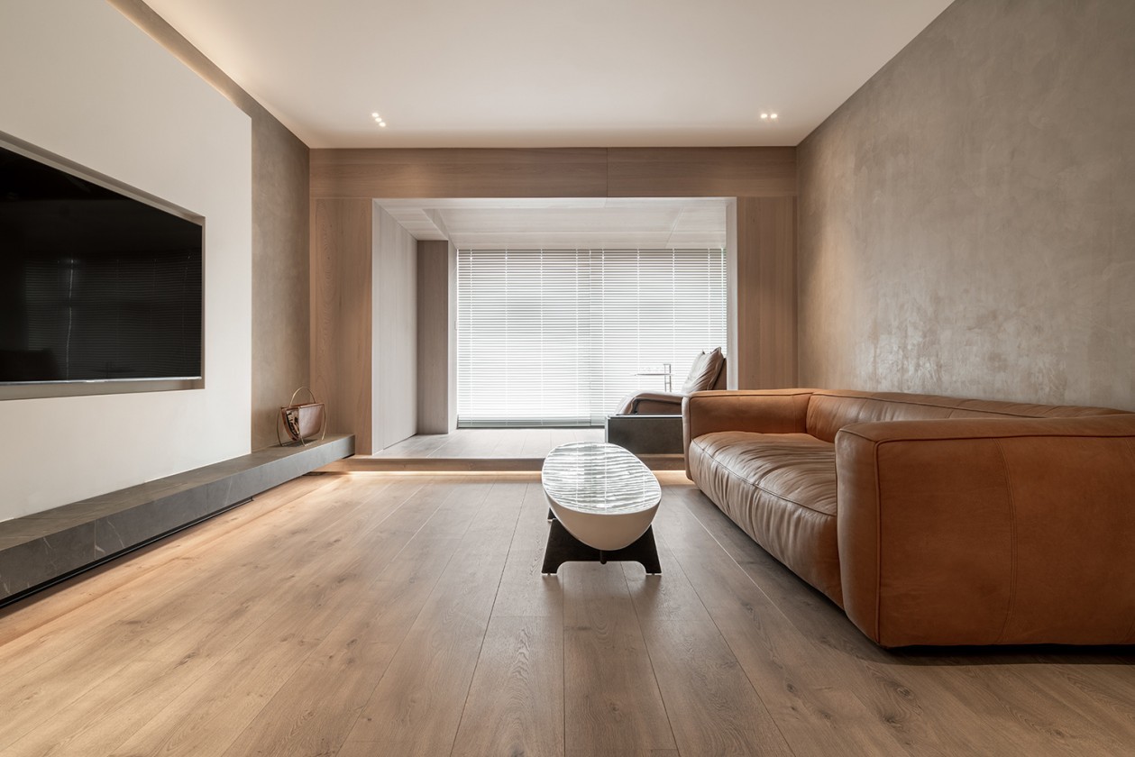 整个客厅都没有使用细碎零散的装饰,棕橘色沙发背靠刷成地板同色系的原木色背景墙;墙面采用嘉宝莉涂料,简约大气。与客厅连通后的休闲阳台也采用同色系的木饰面去弱化承重墙体的存在感;电视内嵌于留白的墙体,船型的白色茶几暗自与之呼应,以贯通的悬空水泥地台替代可移动的电视柜,我们保留了客厅的宽敞感,也在视觉上纵深了空间。