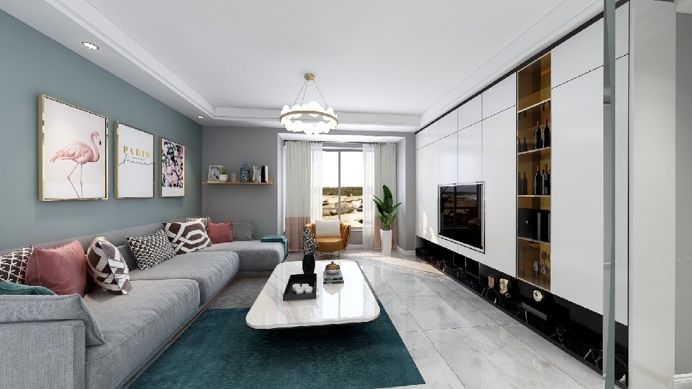 灰绿色作为沙发背景墙,搭配灰色布艺沙发,给人一种舒适、安静、放松的感觉,灰色的墙面与沙发颜色一致,整体装修色系清爽、平静,莫兰迪色属于冷色系,但是却因为素雅的色彩搭配使得冷淡的颜色中带着温暖。