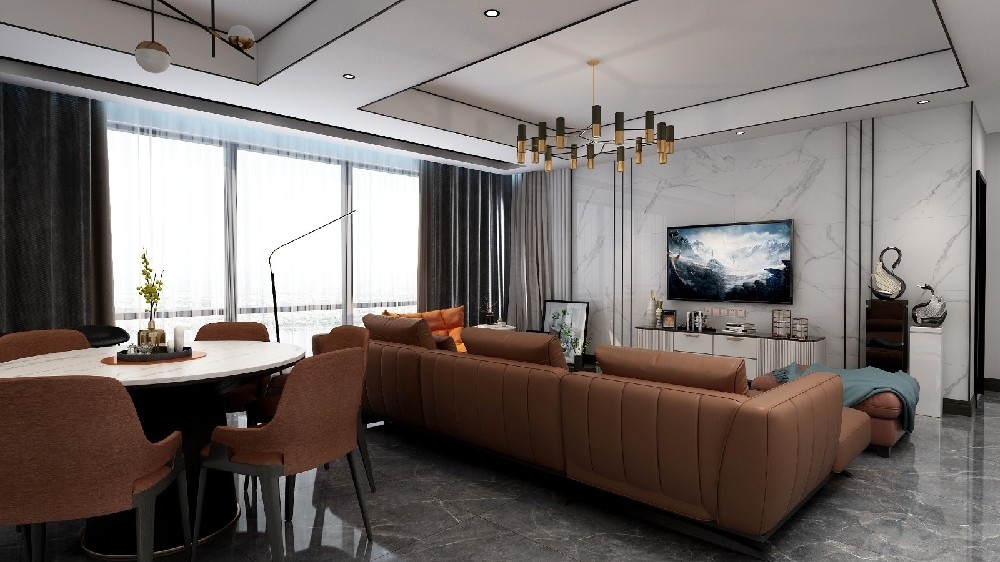 大理石电视墙大气上档次,让整个客厅的装修档次提高很多;黑色线条与吊顶相呼应;整体设计更加和谐,对称;