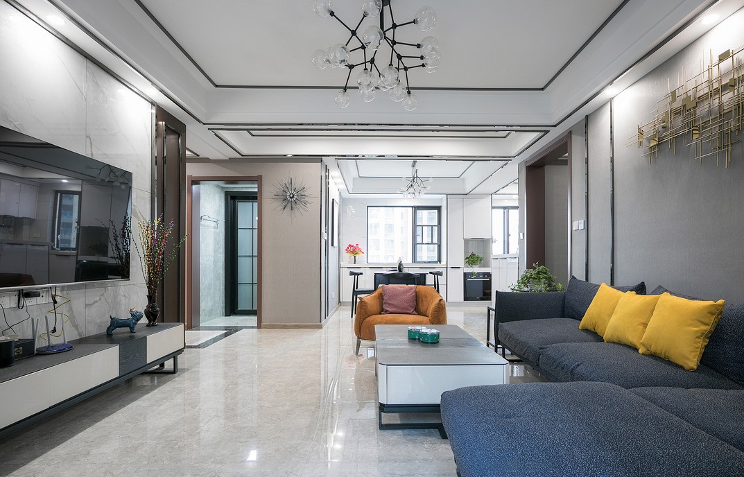 放眼看去,整个客厅以黑白灰为主色调,在内敛的灰色基底下,点缀一些亮丽的橙黄色,为空间注入一抹暖意。