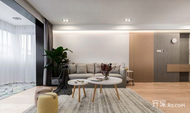 客厅是最能让人放松的地方,进入房屋的那一刻,便能在客厅里放飞自我。沙发前的圆形原木腿茶几,造型简单,可以放置茶水点心等。两个彩色小布墩可以作为沙发的替补。