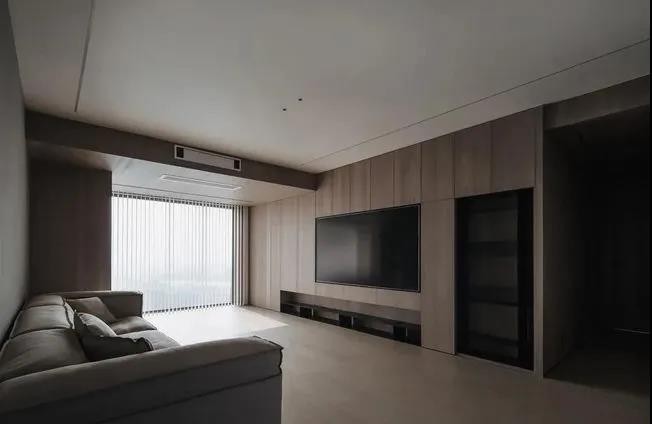 客厅为了打造强大的收纳空间,就定制了一组整体柜,很多人觉得压抑,事实上像她家这样选用木色免拉手的柜体再协调整体空间,并不会有突兀的效果。