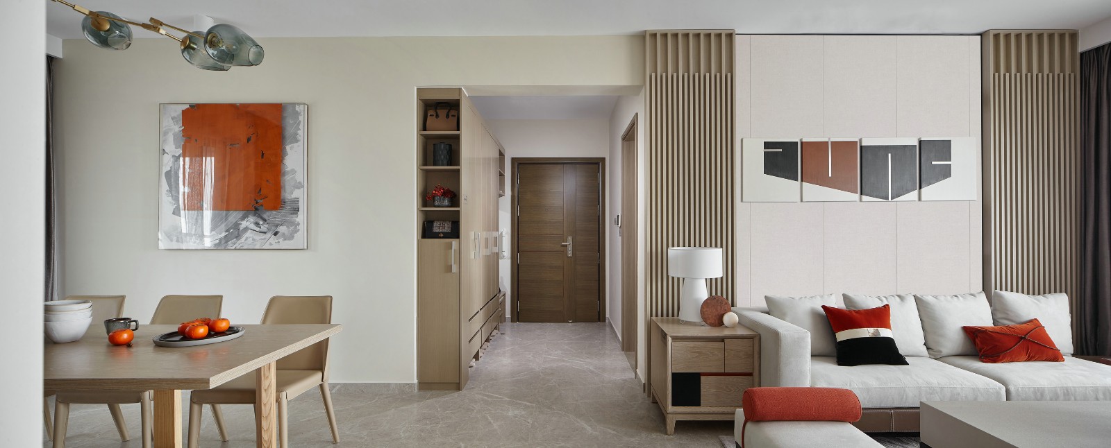 以棕色和素白色为主色调,朦胧橙的椅子打破了这之间的沉静,柔和的阳光透过窗纱散落在屋内,茶几上的青铜像,每一处都呈现出闲适自如的生活气息。