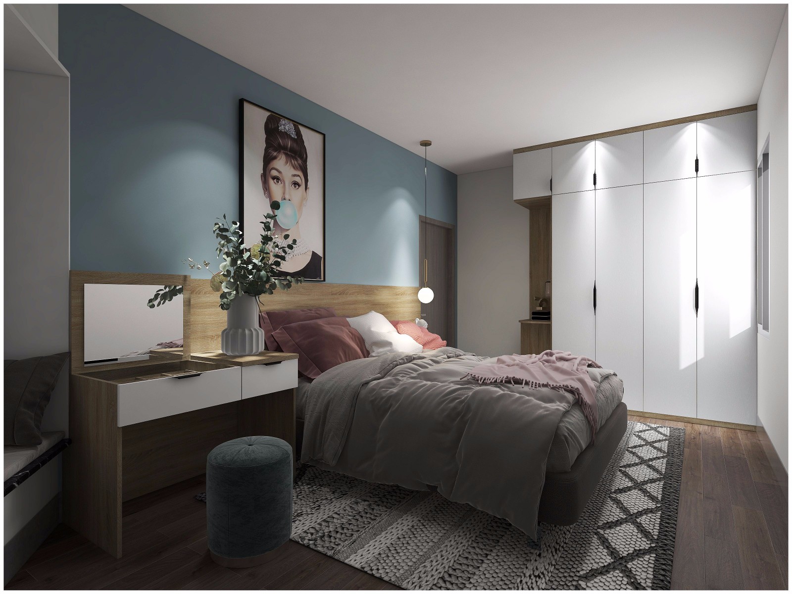 现代简约风的卧室梳妆台,强烈的色彩搭配,打造了舒适的居家空间