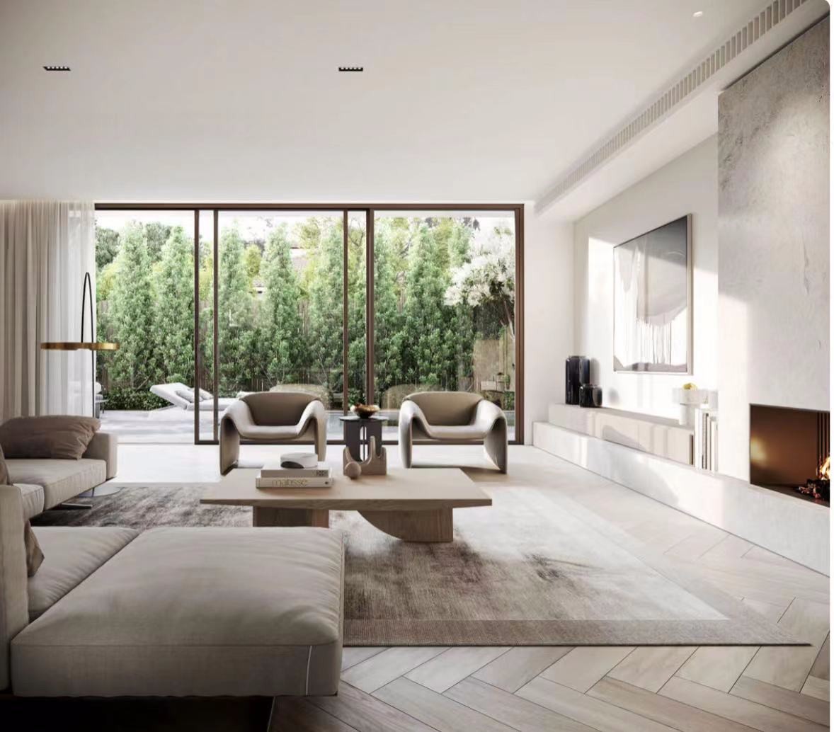 宽大的落地玻璃充分起到引光入室的作用,同时也模糊了室内外空间的界限。全吊顶的天花、无主灯照明设计让视野更简洁大气,侧面空调出风口也做了隐藏处理。