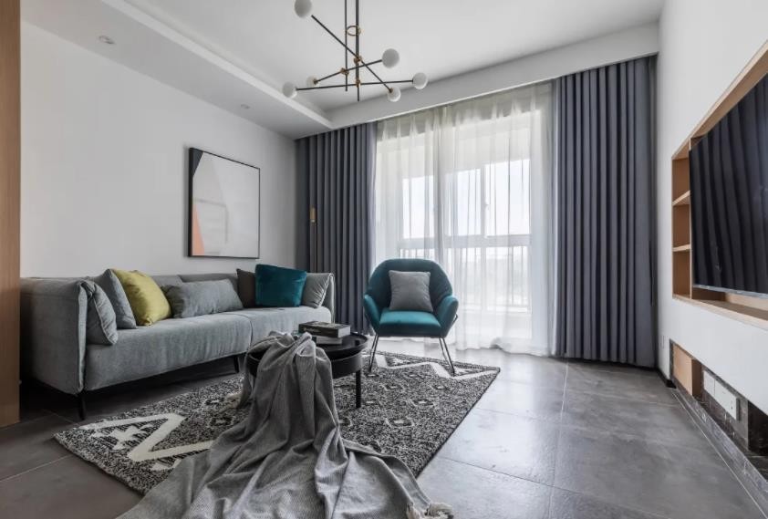 客厅以柔光灰色地砖,整体现代简约的空间氛围,带给人的是一种自然轻松与舒适的体验。