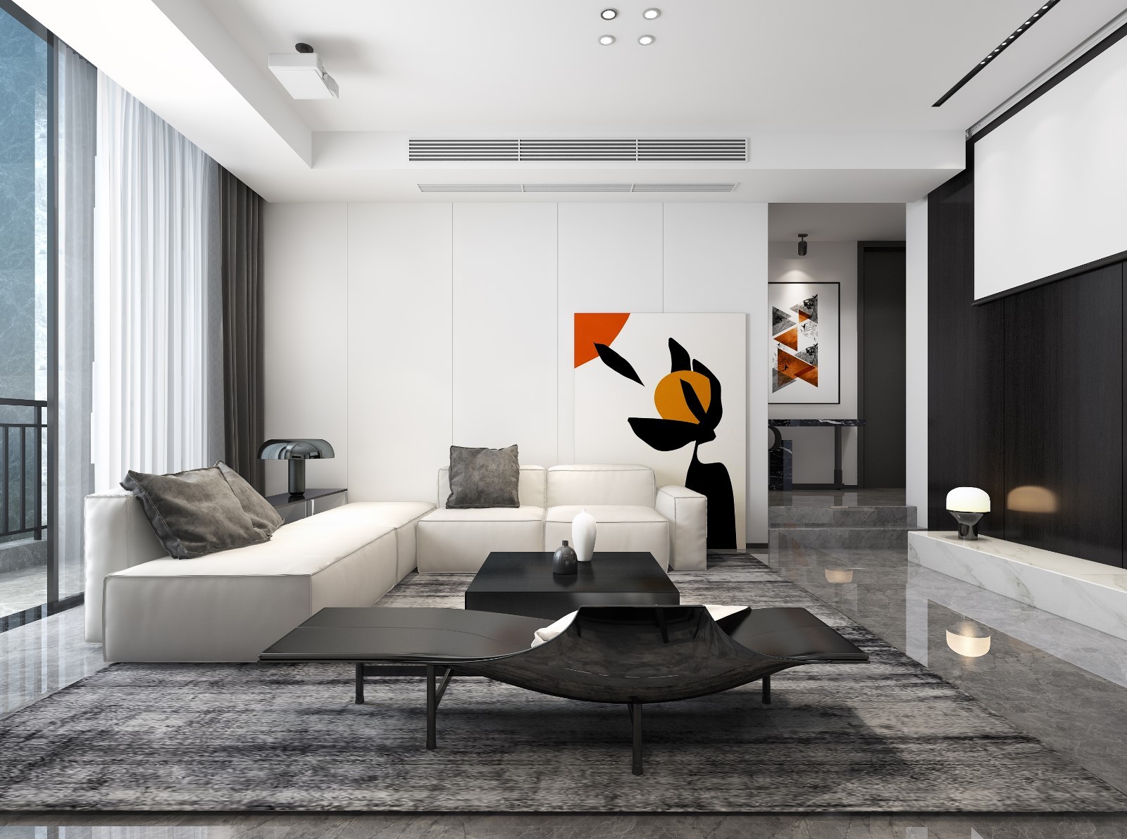 黑白调的主题颜色,无电视的设计,客厅使用投影幕+投影机来满足视频需求,天花无主灯,5瓦的筒灯组合来组成整个空间的光源。