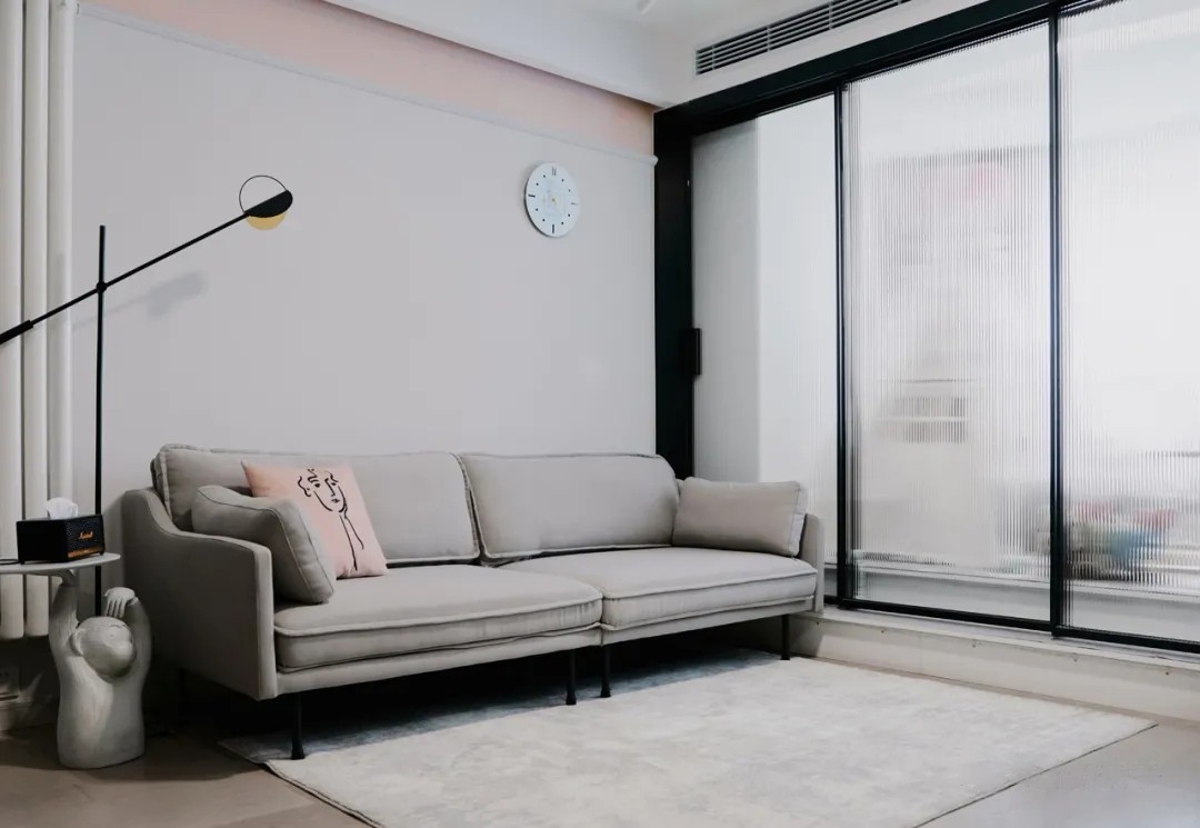 关上推拉门,两个空间各自独立,长虹玻璃透光不透人,保证了隐私性,也让客厅更加清爽整洁。