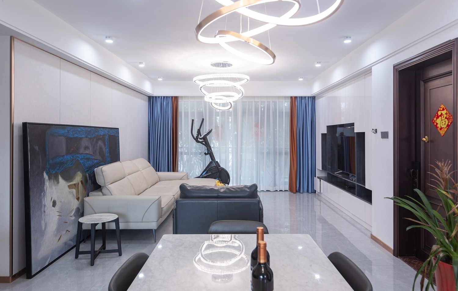 踏入其间,视觉感受就是亮白宽敞。蓝橙配色的窗帘时尚亮丽点缀空间,与装饰画互为映衬,增强艺术氛围。电视嵌入定制柜中,整体感强且扩大储藏。