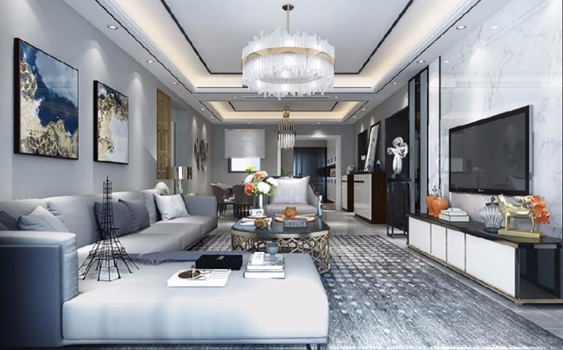 整个客厅以黑白灰为主,为了节省空间,采取中央空调的做法,显得干净利落,天花利用走边槽,采用雷钛不锈钢来点缀,增加氛围。电视背景墙用大板薄片瓷砖,显得更加明亮大气。