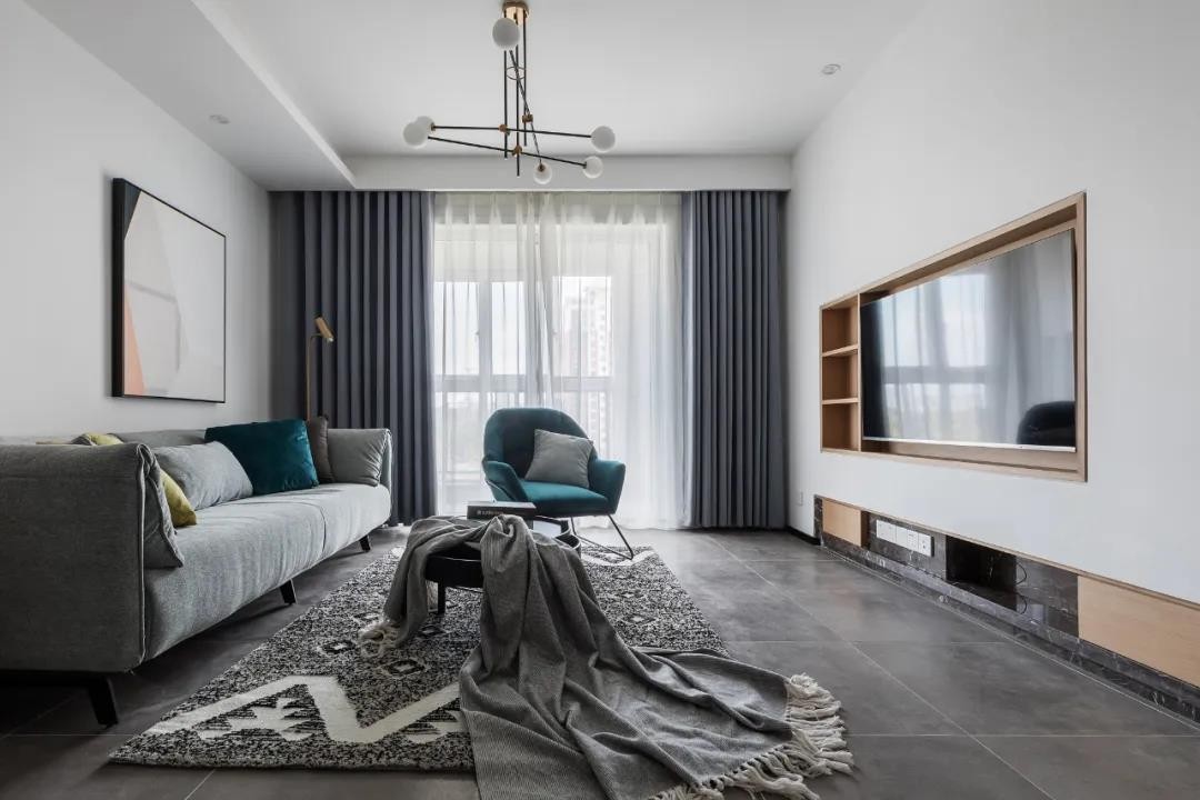 沙发墙简洁的基础,挂上一幅极简的装饰画,左侧加入一个冰箱收纳柜,摆上灰色布艺沙发、地毯,还有雀蓝色的布艺休闲椅,为主人营造出了一个简约闲适的居住空间感。