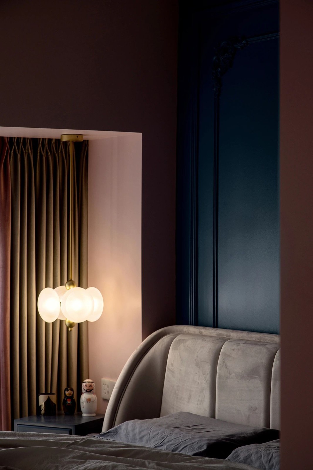 主卧特意打造了休息区+衣帽间+书房+卫浴间的多功能套房形式,动线顺畅自由,使用舒适便捷。同时,延续客厅对比鲜明的撞色设计手法,重要立面以藏青色和脏粉色组合使用,打造视觉焦点。搭配造型个性、有质感的软装,勾勒出一派舒适优雅的气质,仿佛只要进入空间,便能屏蔽喧嚣,安心享受居家时光。