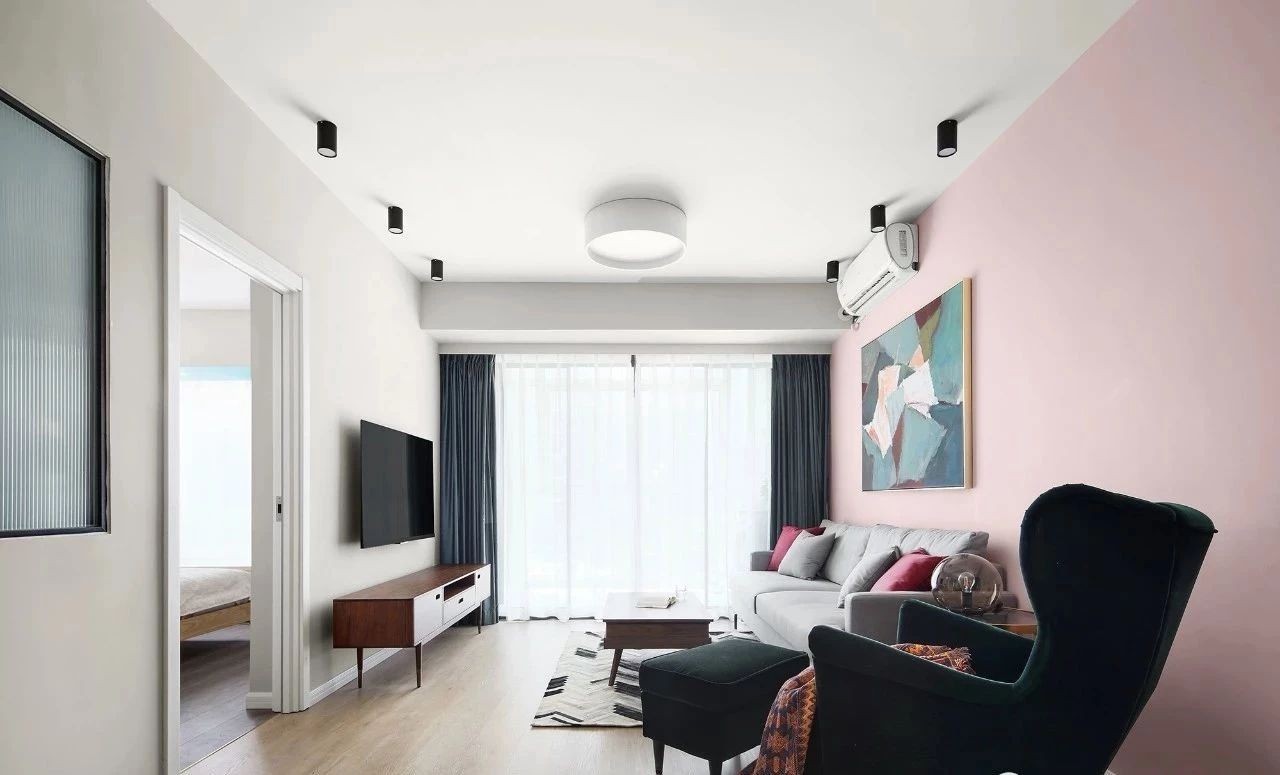 粉色背景从玄关一直延伸到客餐厅,也在整个简暖调性的居家氛围中,融洽得恰到好处。
