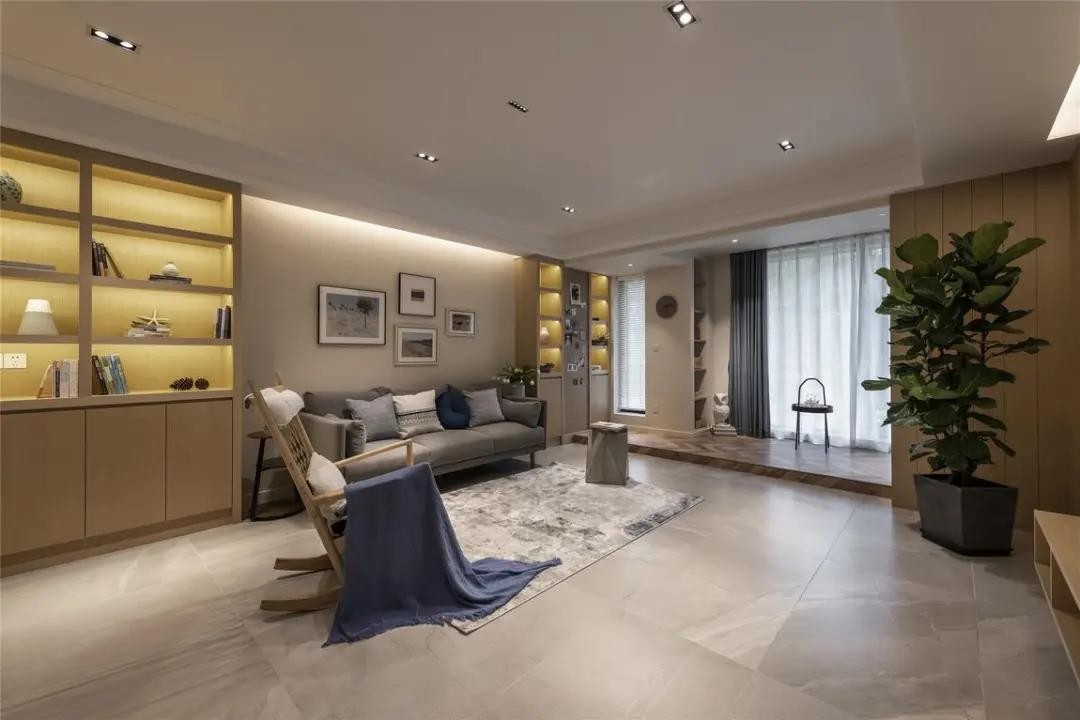 浅咖色的沙发墙上挂一组照片墙,两侧是定制的收纳柜+展示架,在沙发墙上方的吊顶留出了一个暗藏灯带的槽位,反射光烘托下,让客厅显得格外的温馨舒适。
