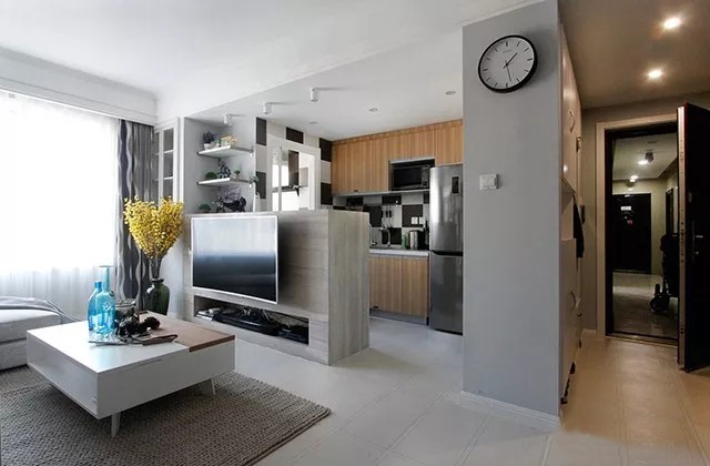客厅的电视背景墙做成吧台,上面做一些格子,可以很好的和厨房结合