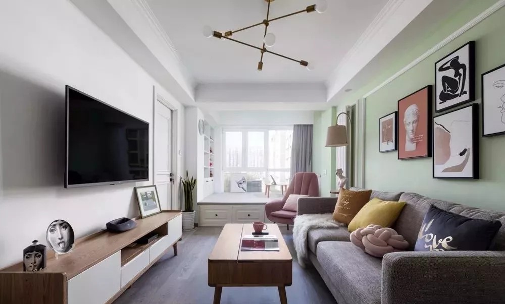 整体做森系的主题,采用淡绿色作为沙发背景