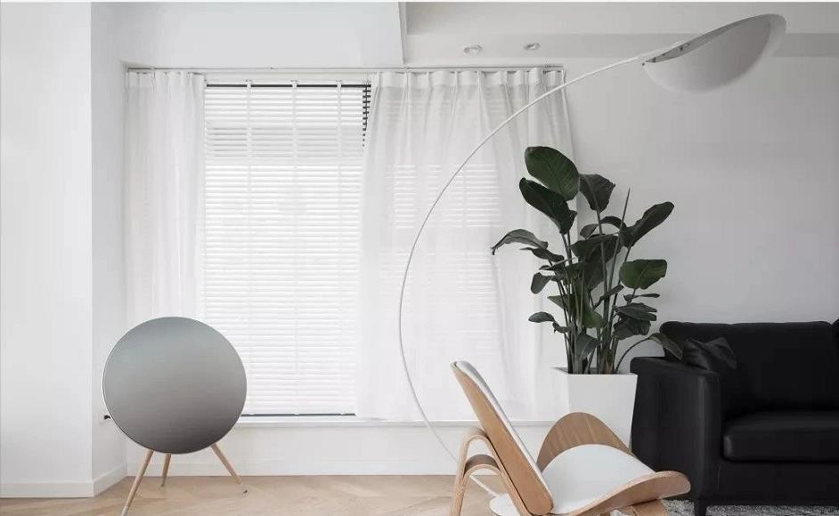 沙发一侧放上一盆大型绿植,以平衡人的视觉感受。时尚线条的音响与落地灯设计感十足,丰富空间层次的同时彰显了屋主的品位与格调。.jpg
