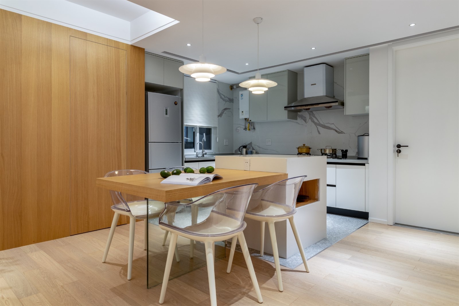 开放式厨房已成为时代的潮流,既延伸视觉,也可扩大操作面板,行径动线也会更加的丰富,餐桌背面为一个木饰面装饰,并且隐藏了储物间的门;