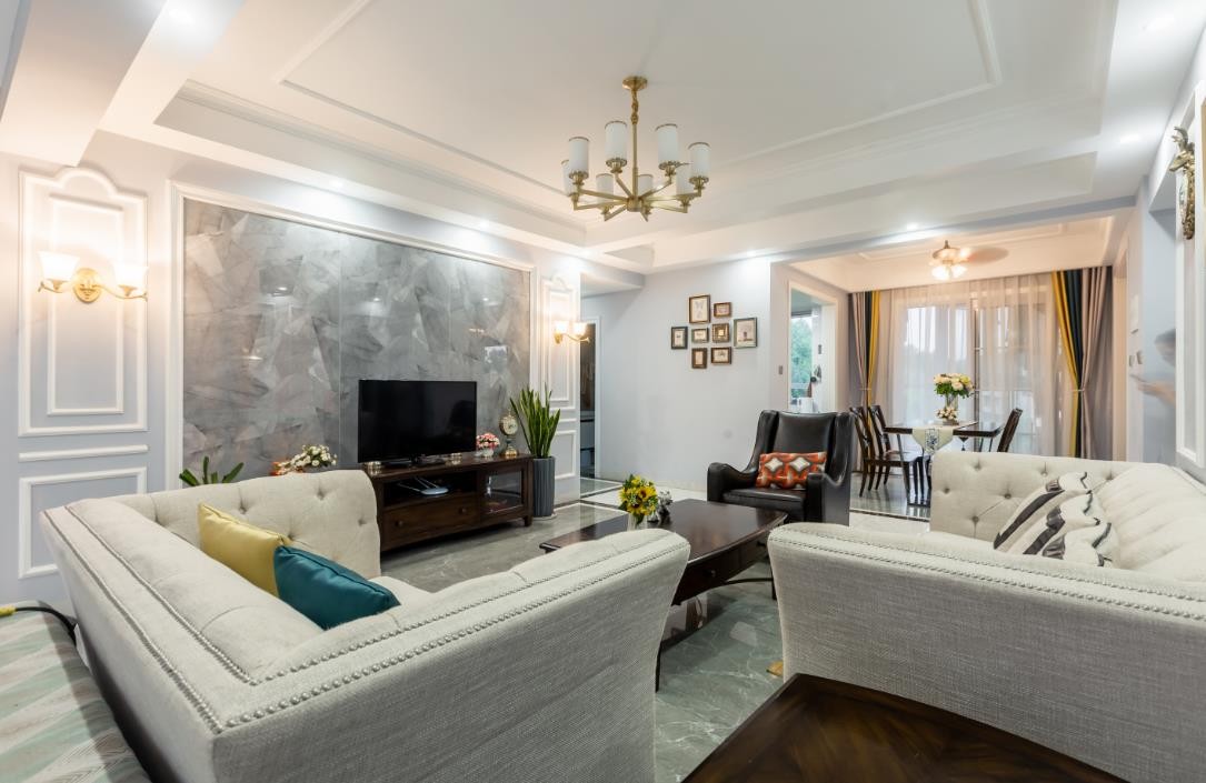 客厅整体都是淡雅的风格,美式米色布艺沙发给人舒适的感觉,搭配胡桃木电视柜和茶几,又让客厅多了些优雅和***。躺在这样的沙发上喝着茶,简直不要太舒服。