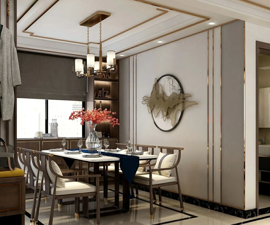 新中式餐厅。墙面软包+装饰挂件