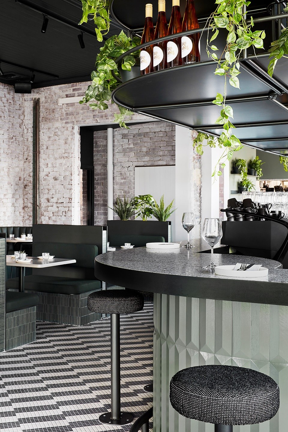 黑色的吧台,绿植、方块地砖,营造绿色健康的用餐环境。