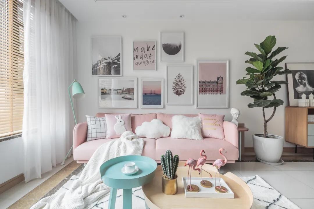 客厅保留了原有的白色基调,马卡龙色调的蓝、粉沙发搭配干净的白纱帘与木质百叶窗,让整个空间充满清新自然的味道。