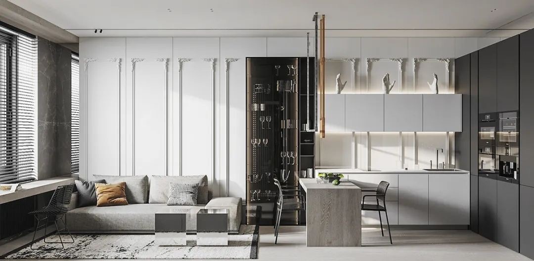 为了保留空间的通透性,利用开放式厨房的布局,让整个空间融为一体,