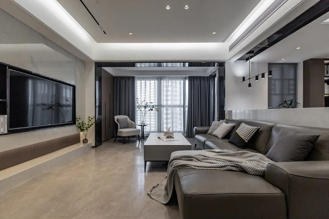 客厅使用了多种材质,石材、木质、金属、布艺等元素,带来视觉上的丰富变化