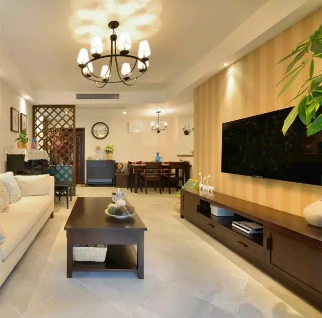 客厅设计是美式的简约风格,深色电视柜、茶几搭配浅色沙发,显得年轻而又不失稳重感。