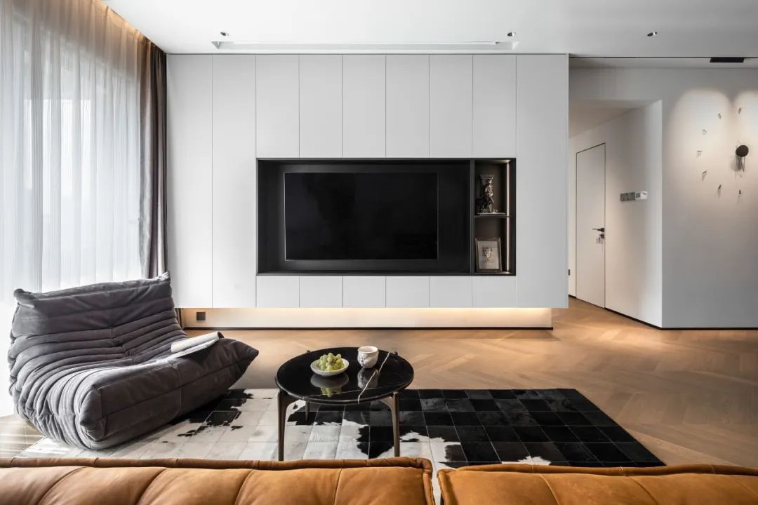 电视背景墙做了悬空的设计,让原本厚重的柜子轻盈起来,同时在底部预留了插座,扫地机器人也有了自己的归属地。电视背景柜体增加储物功能,最下面一排做成了抽屉便于使用,投影幕布+电视机都保留了,可以打游戏、亲子娱乐、看电影等 。