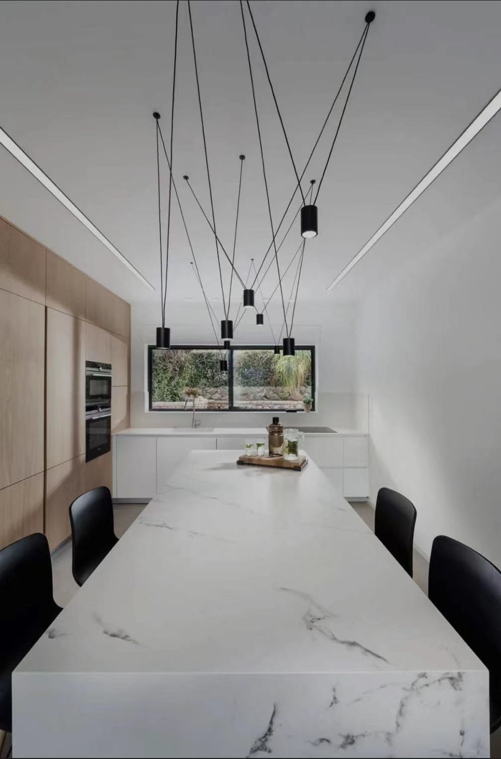 大大的餐台,白白的大理石台面,配上黑色的灯点缀