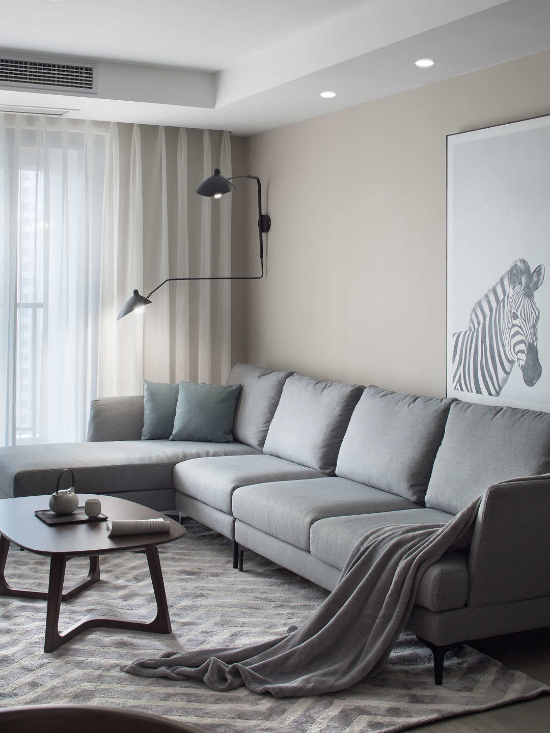 客厅无主吊灯设计,采用筒灯、射灯和壁灯的完美结合,干净又不显呆板。