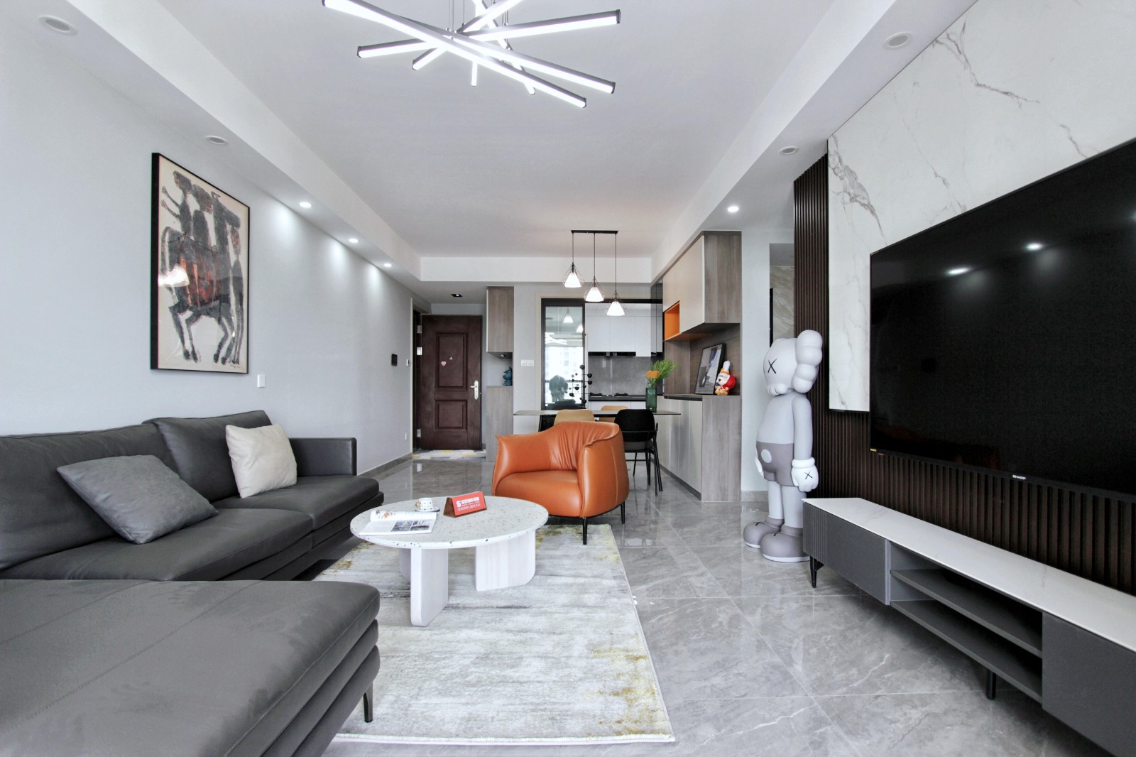客餐厅为一体,由玄关延伸,通铺灰色大理石地砖,使整体无边界感。