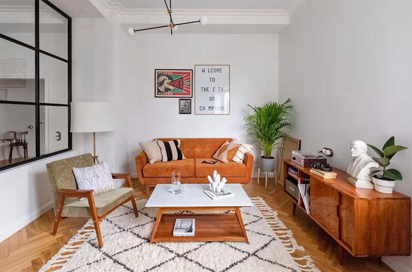 整个房屋的墙壁都刷成白色,简洁干净。 利用黑框玻璃门加上半截矮墙,既划出分客厅的独 立空间,又保留一定的私密性。 而且整个空间的采光也很棒。