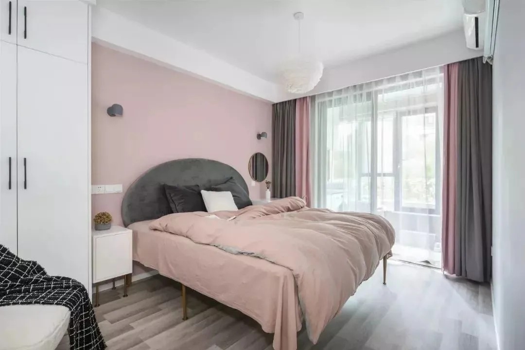 主卧室的色调以粉色为主,背景墙、床品、窗帘都加入了粉色调,部分点缀一些金属元素,让整个卧室变得更加优雅、精致。