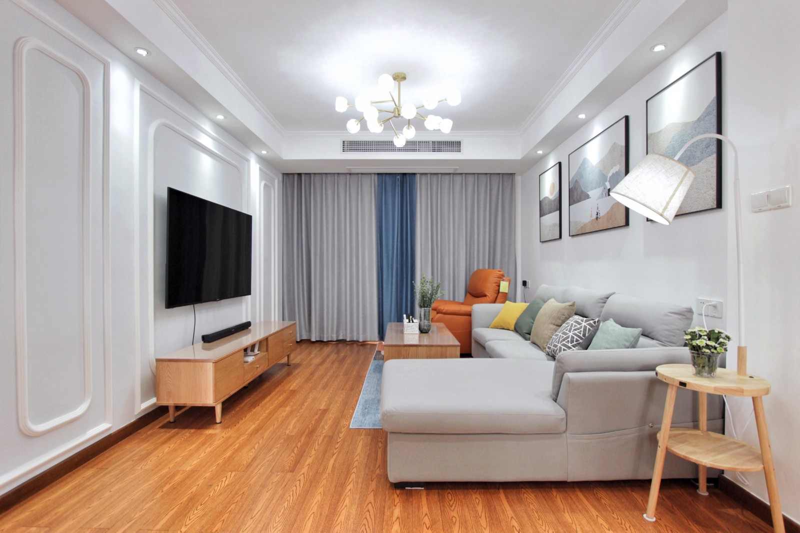 吊顶为简约的石膏线雕刻,L形沙发搭配一人坐橘色沙发,给客厅空间增加亮丽的跳色。