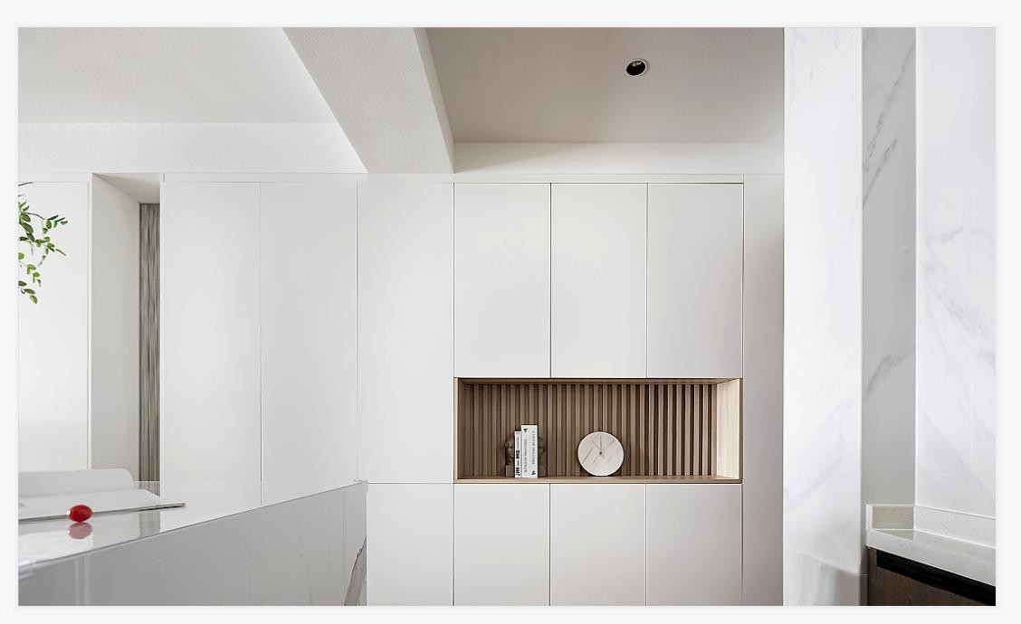 厨房家电完美利用立体空间合理收纳摆放,采用留白,带给厨房空间无限的清新与自然。