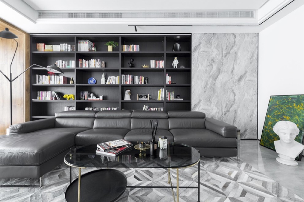 超大面积的落地窗与木制地台营造出极其开放的视觉效果平时喜欢看看书,所以希望客厅可以有一些放书和摆件的地方。仿大理石纹的推拉门,里面隐藏了一些秘密,专属于男主人自己的秘密呢。电视背景墙下的壁炉出自MOLONEY,设计师之所以选择3D雾化壁炉的设计,是不希望有过多造作的修饰与约束,不经意中可以散发一种休闲式浪漫。