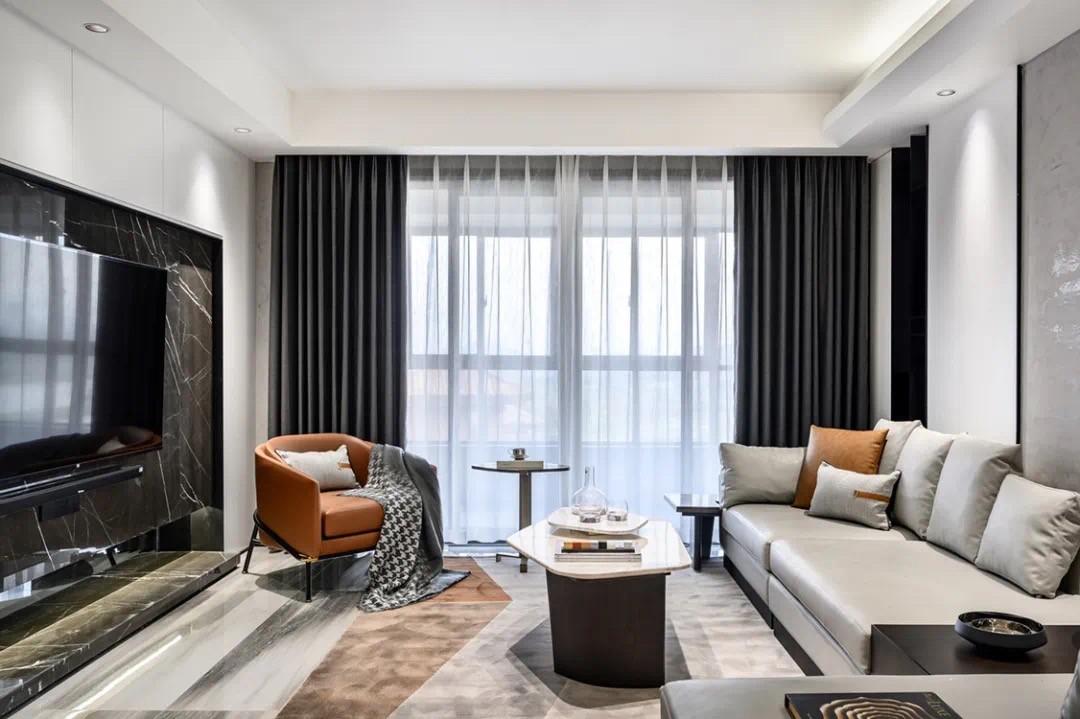 客厅电视墙以灰色大理石材质的设计,还装上一个灰色大理石地台,也让空间显得更加优雅端庄。
